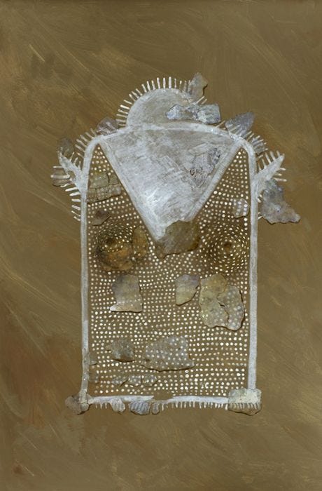 Die sogenannte Kultwand zeigt sieben Frauen mit plastisch ausgeformten Brüsten und sonnenstrahlenförmigen Köpfen. Dazwischen sieht man abstrakte Stammbäume und kleinere Figuren.